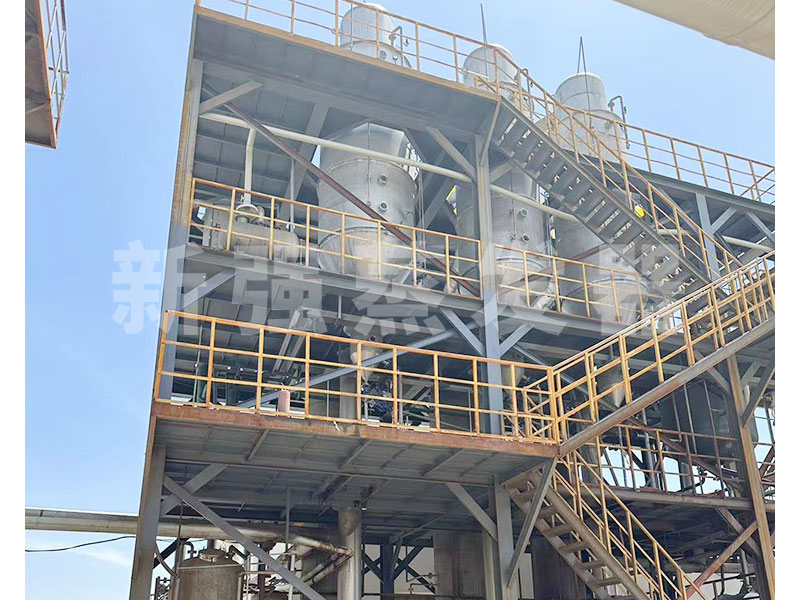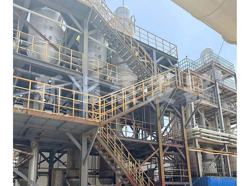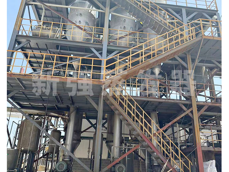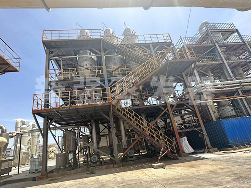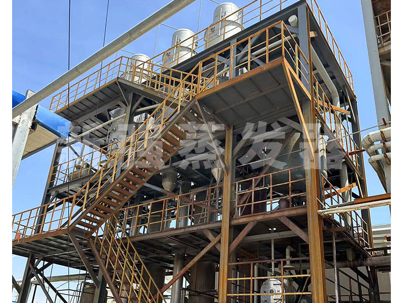 蒸發器的兩大部分換熱室和結晶蒸發室,通過循環泵,液體在列管中循環,在高于正常液體沸點壓力下加熱至過熱。進入分離器后,液體的壓力迅速下降,導致部分液體閃蒸,或迅速沸騰。蒸發產生的二次蒸汽進入下一效蒸發器加熱或進入冷凝器冷凝。濃縮液被循環泵送至鹽分離器,在鹽分離器內使鹽水有效分離。